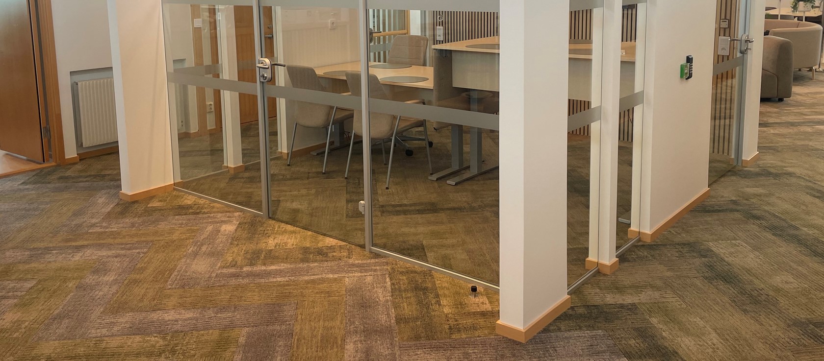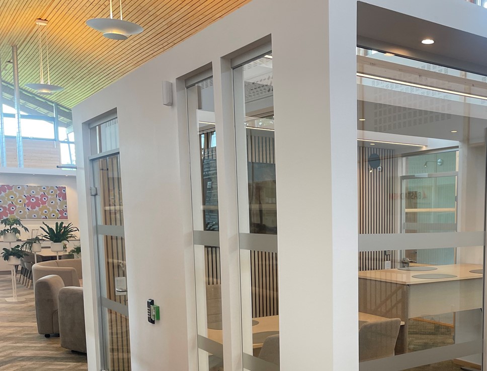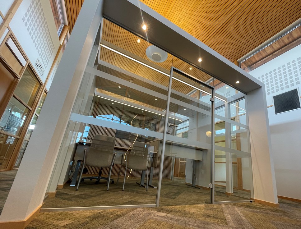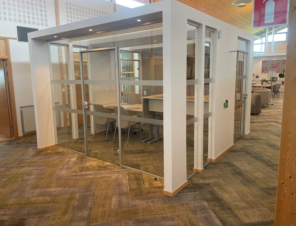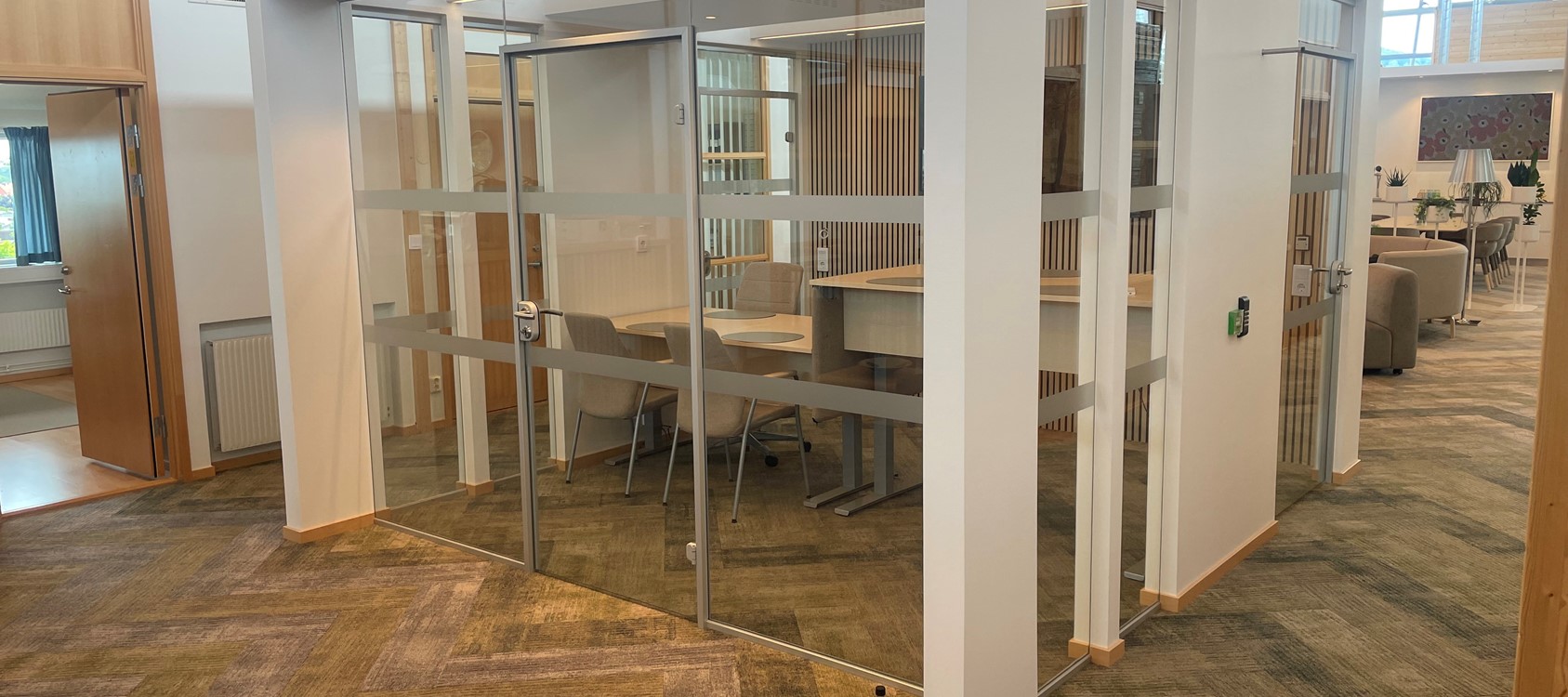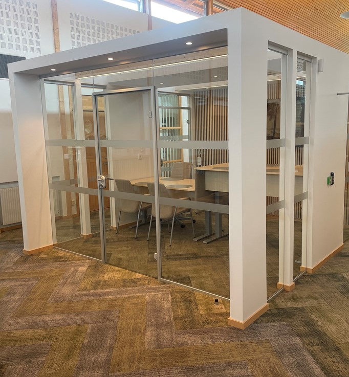 Under våren 2024 fick vi av Båstadhem förtroendet att leverera och montera kontorspartier till ett deras nya mötesrum. I detta projekt ingår fasta glas, helglasade dörrar och glastak för naturligt ljusinsläpp.
