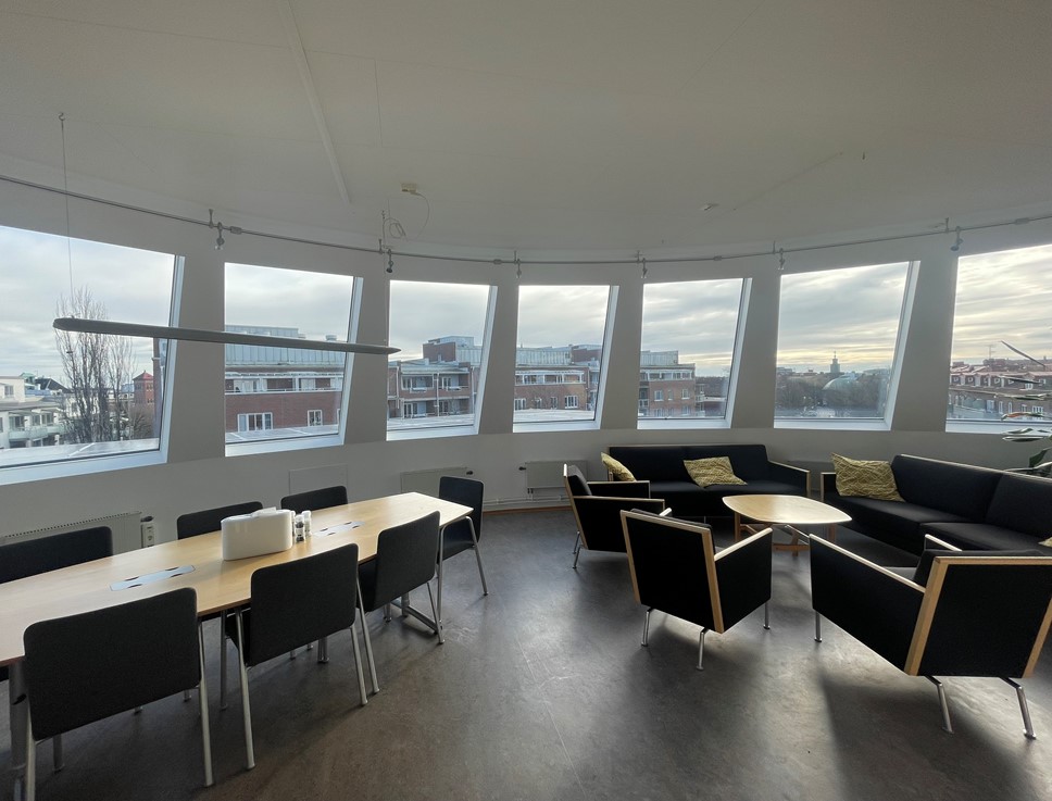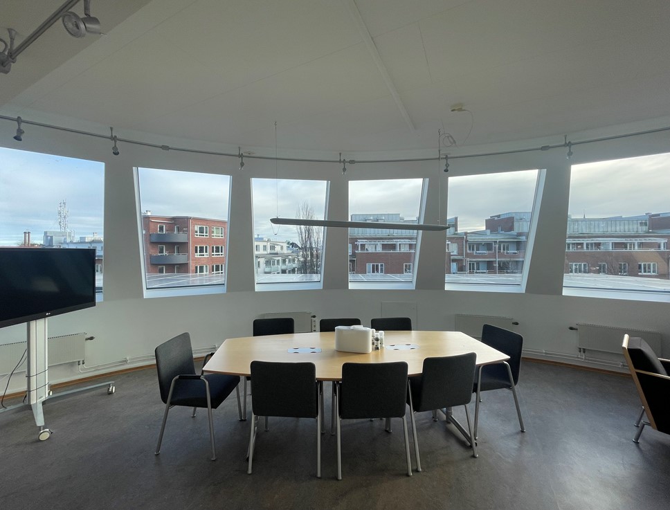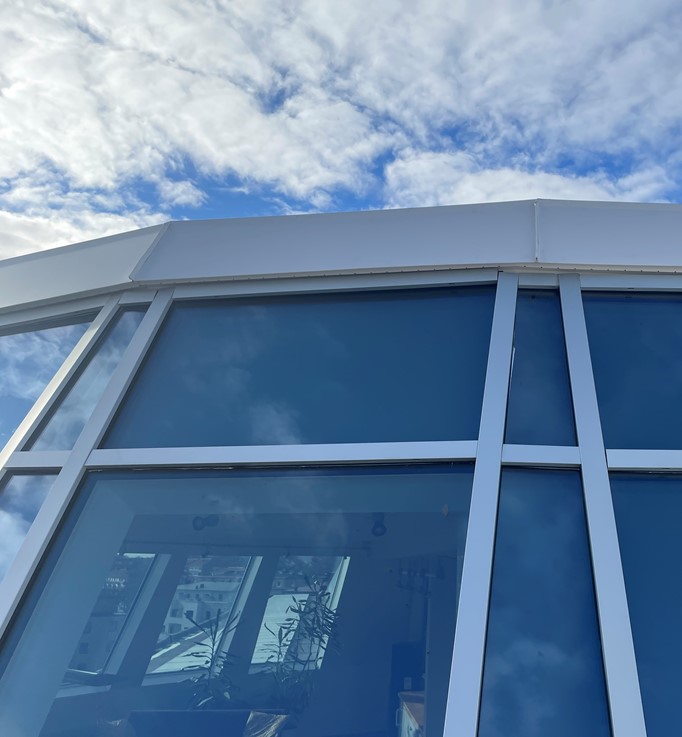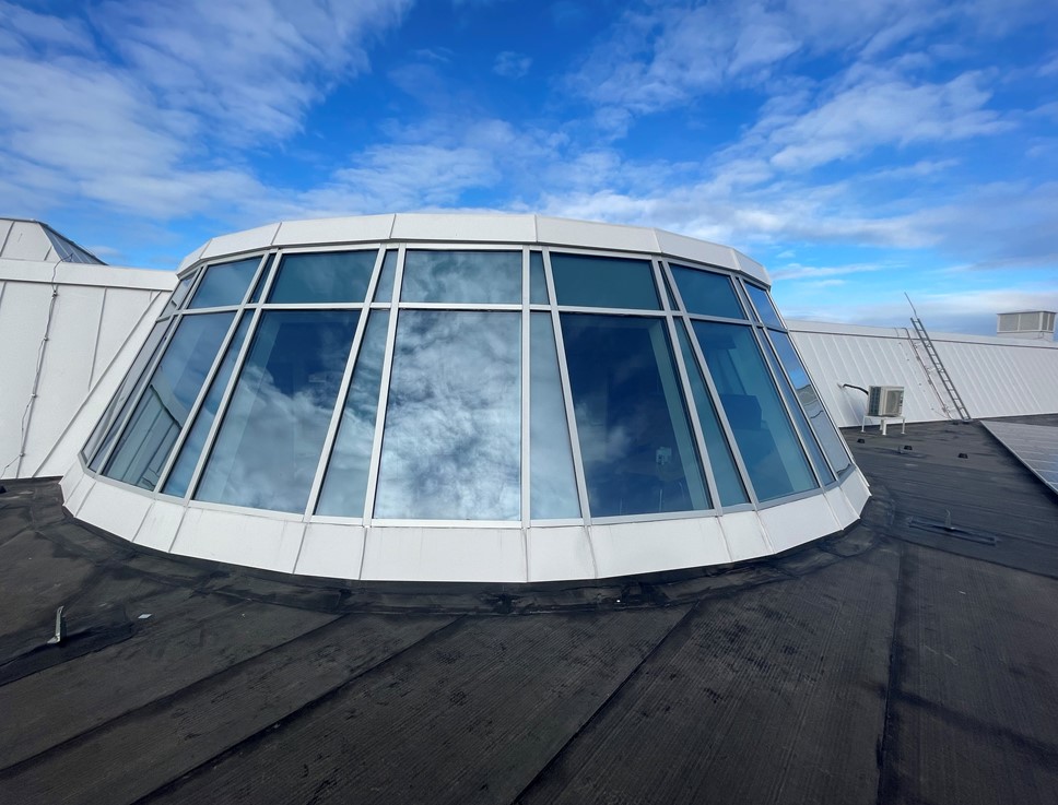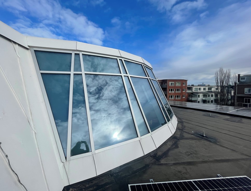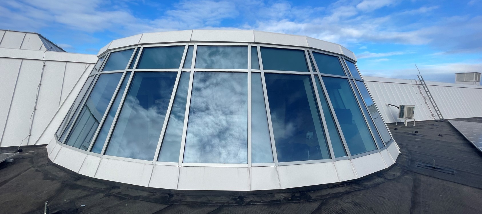 Alufasad har till projektet levererat och monterat ett nytt svängt glastak till övre plan.